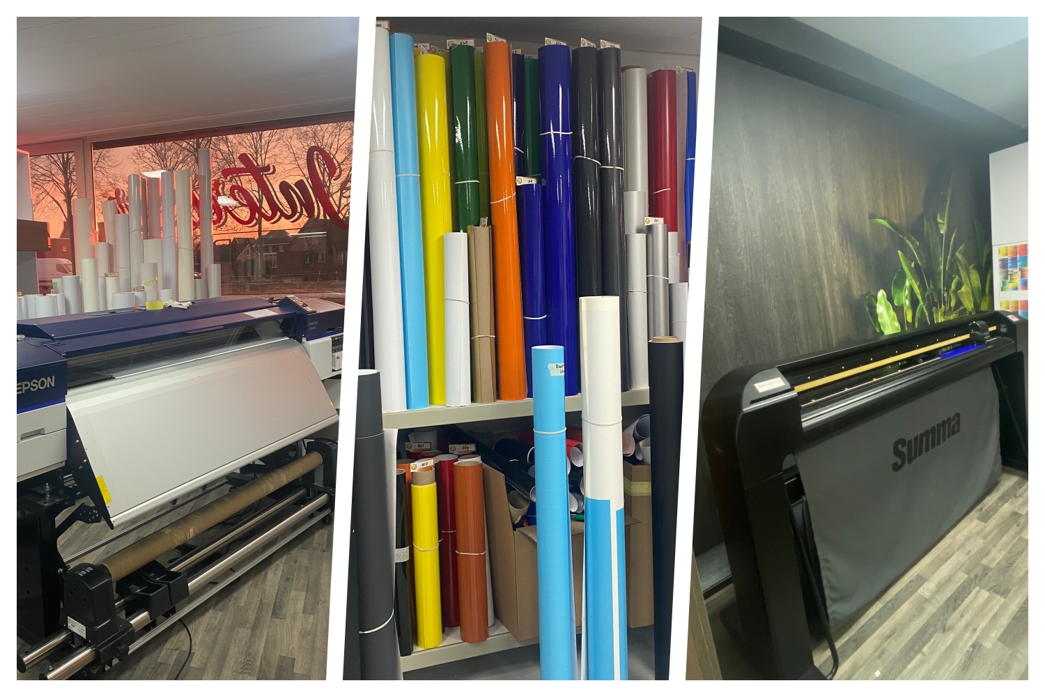 In deze professionele omgeving wordt gewerkt met onder andere een printer, plotter, zandstraler en transferpers, samen met een uitgebreide collectie sign- en foto sign-folies in uiteenlopende kleuren en afwerkingen.
