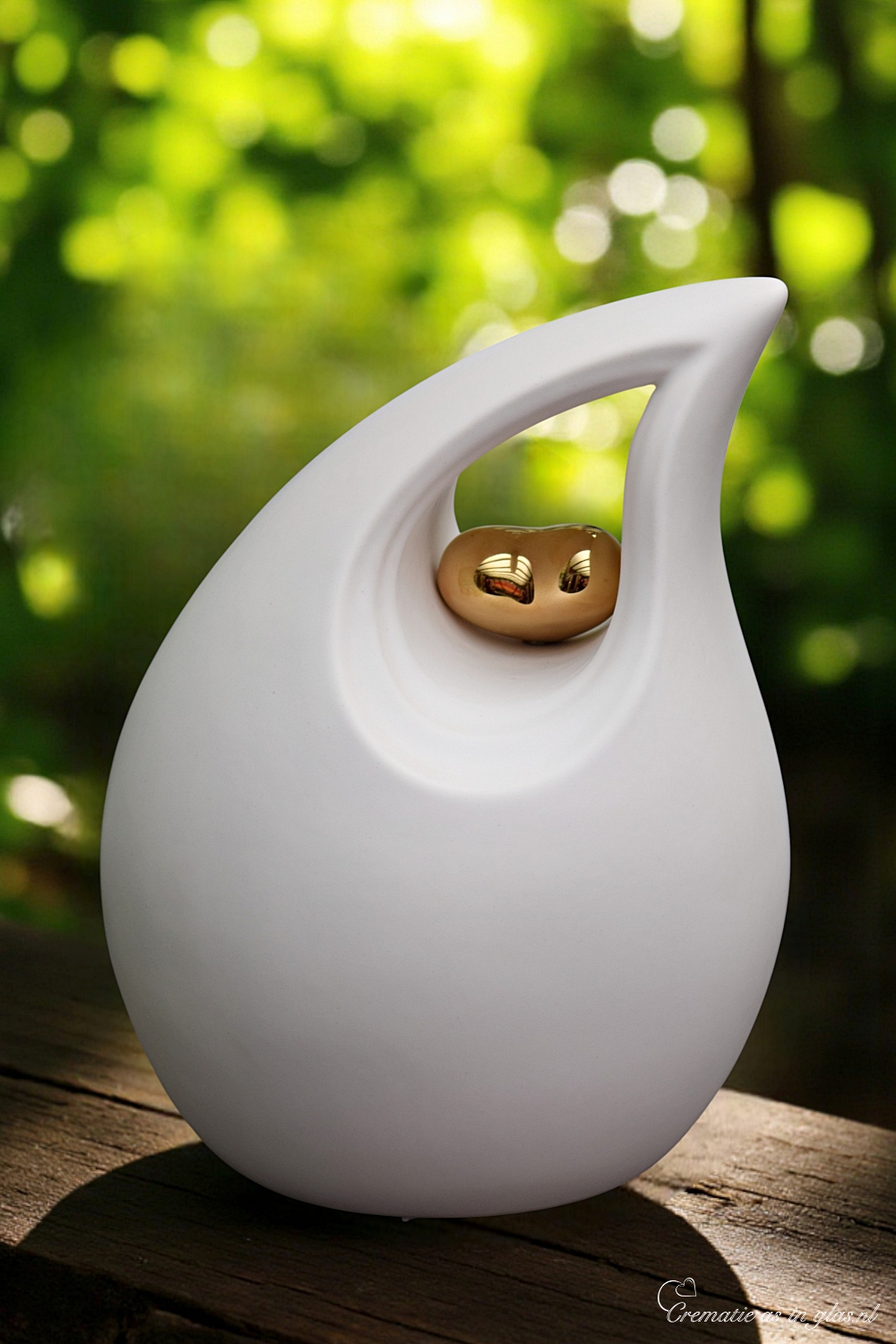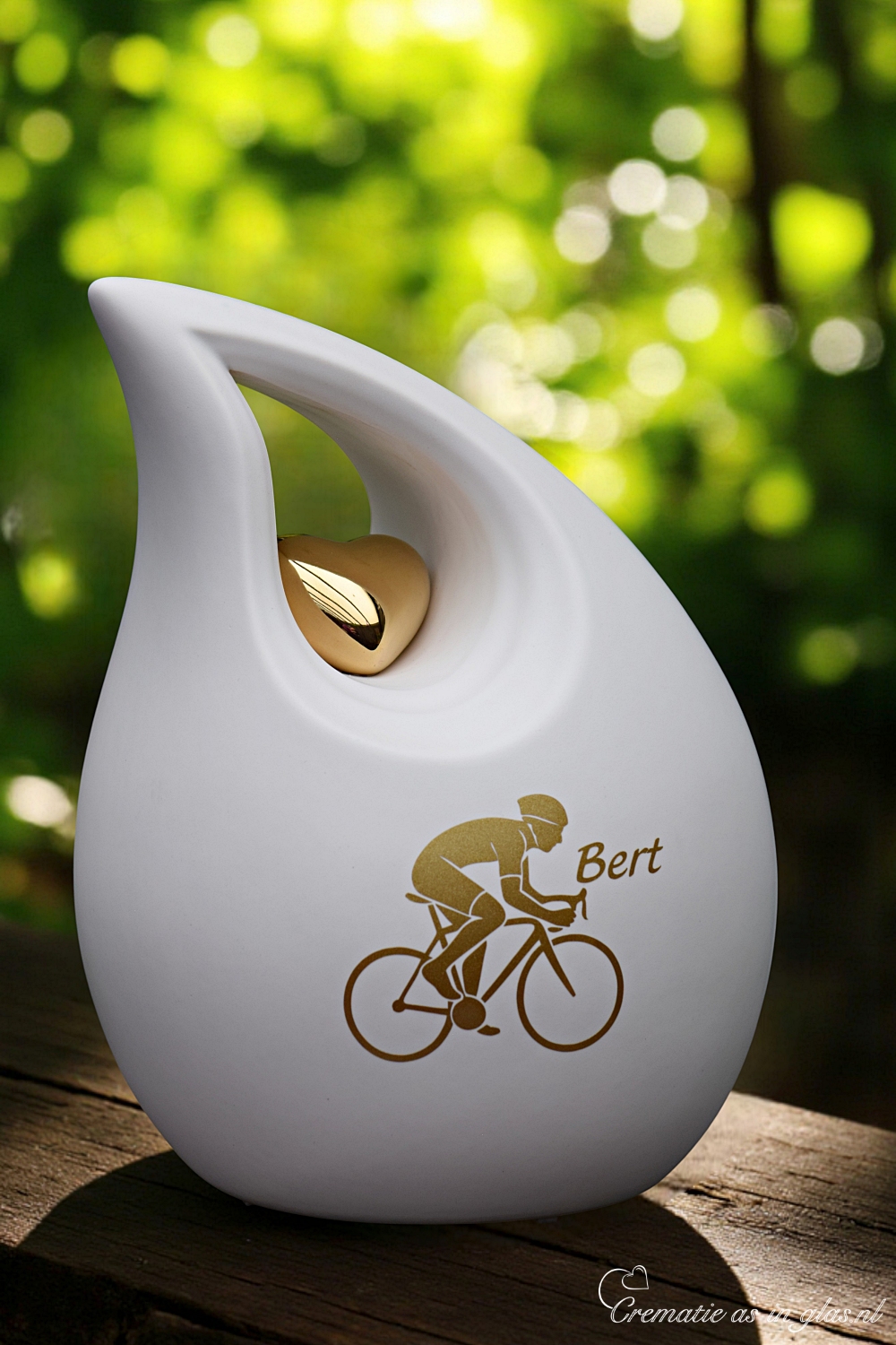 Met een hoge kwaliteit metallic goudkleurige sign folie worden een naam en een afbeelding van een wielrenner op deze schuine traanurn geplaatst. Deze urn heeft een inhoud van 3,8 liter. Er ligt een goudkleurig hartje op deze mat witte urn van keramiek. Bij bestelling van de urn worden een sluitdeksel van keramiek, een binnenzak en een handleiding (hoe u de urn kunt vullen) toegevoegd. In overleg kan er gekeken worden naar mogelijkheden als u eventueel andere afbeeldingen of symbolen op deze urn wenst.